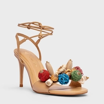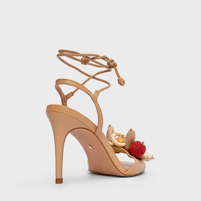 Sandália de couro com bico arredondado e salto alto. Possui tiras delicadas para amarração no tornozelo e tira sobre os dedos com aplicações artesanais.