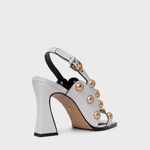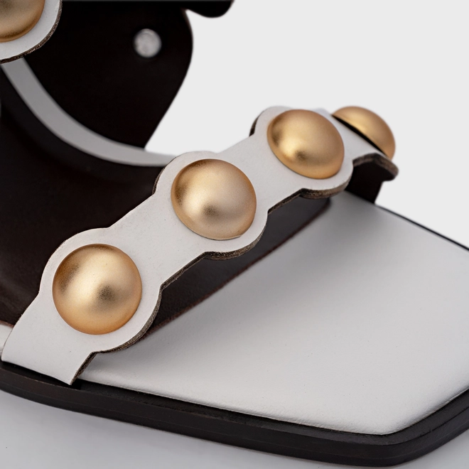 Sandália em couro, com bico arredondado e salto levemente curvado. Possui tira acima dos dedos e tira no peito do pé com recortes circulares e aplicações de esferas, além de fechamento por fivela.
