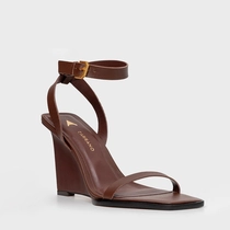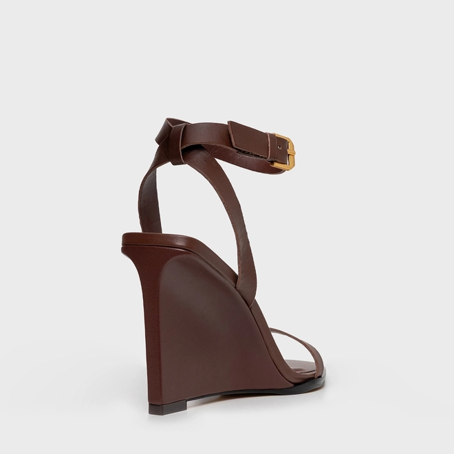 Sandália em couro com salto anabela e bico quadrado. Conta com tira sobre os dedos e outra no tornozelo com fechamento em fivela.