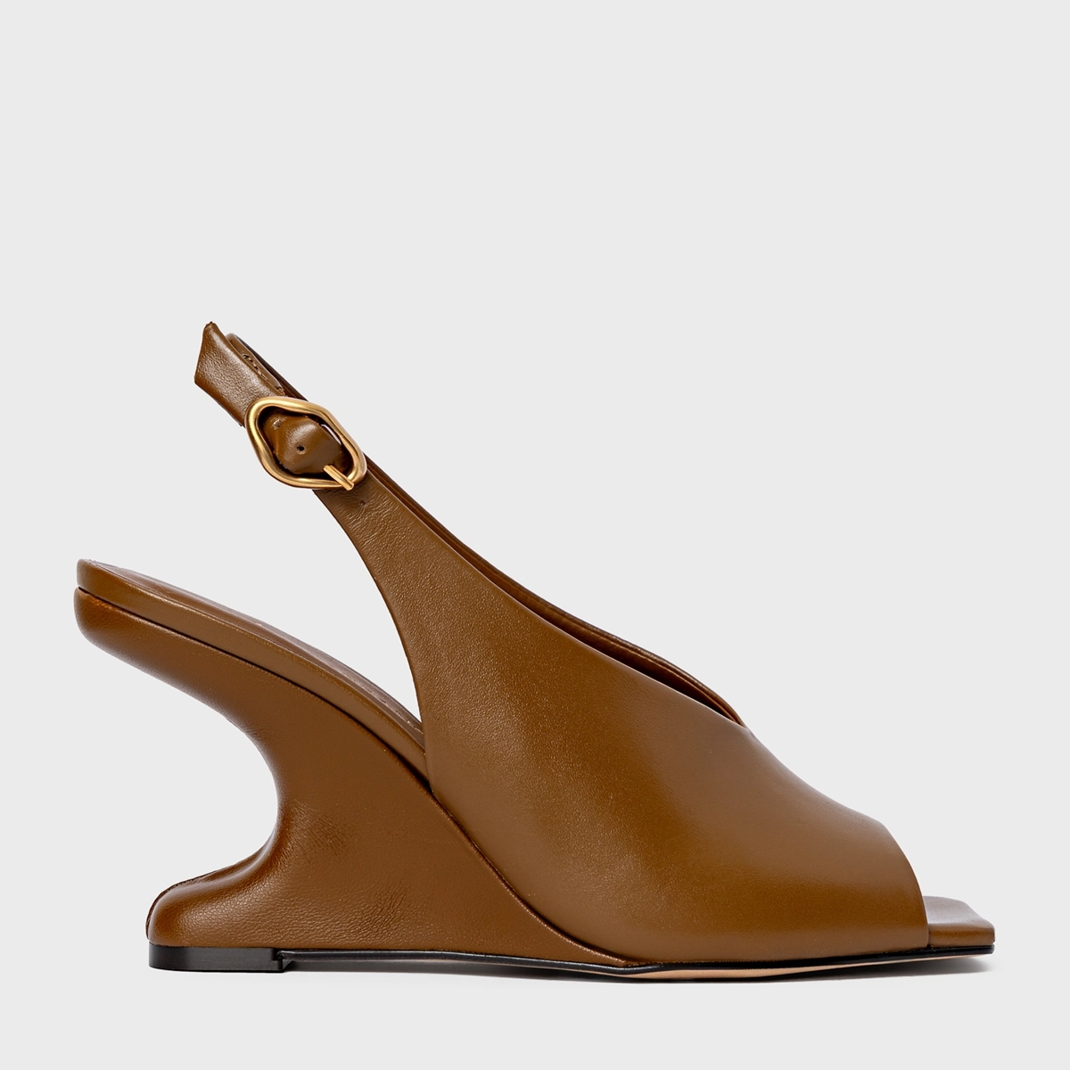Sandália em couro com salto anabela e bico quadrado. Seu salto é levemente recuado para dentro, tira com decote arredondado sobre o peito do pé e fechamento em fivela.