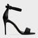 Sandália de couro com salto fino alto e bico arredondado. Conta com tira sobre os dedos e outra no tornozelo com fechamento em fivela.
