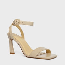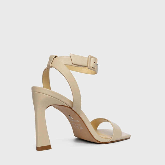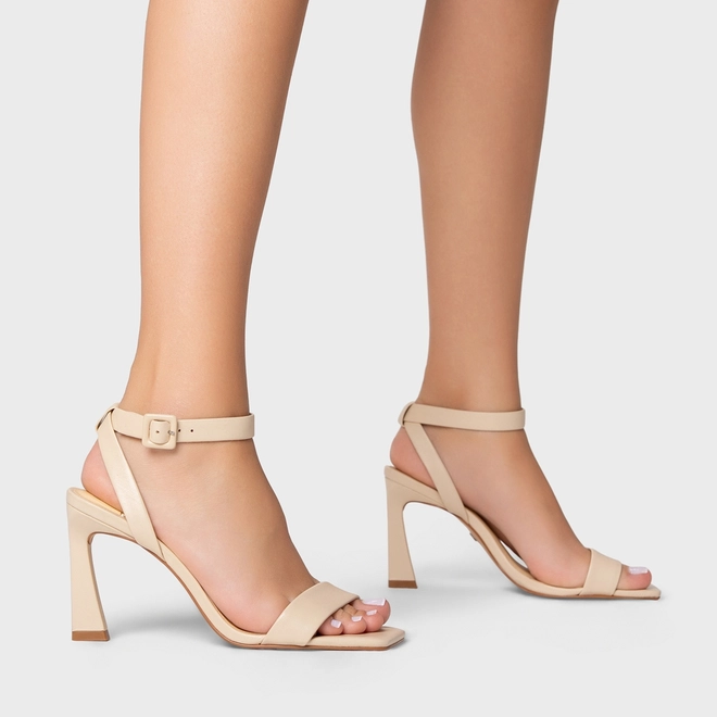 Sandália em couro, com salto alto levemente curvado, conta com um bico quadrado. Possui uma tira sobre os dedos e outra acompanhada de seu fechamento por fivela.