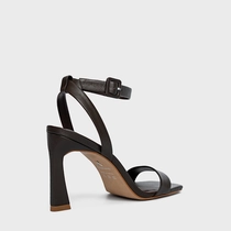 Sandália em couro, com salto alto levemente curvado, conta com um bico quadrado. Possui uma tira sobre os dedos e outra acompanhada de seu fechamento por fivela.