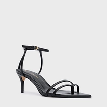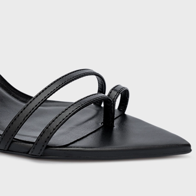 Sandália em couro com bico folha. Possui uma tira fina que envolve o dedo hálux e outra tira para os outros dedos. Salto fino estilo kitten heel. Fechamento em fivela ajustável.