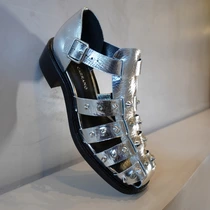 Sandália fisherman (ou pescador) em couro spechio, conhecido por suas tiras entrelaçadas. Esse modelo conta com um salto bloco, aplicações de studs e fechamento com fivela ajustável.