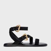 Sandália em couro suede, com rasteiro e bico arredondado. Possui tiras que envolvem todo o pé até o fechamento por fivela ajustável, além de duas fivelas marcantes que trazem contraste.