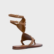 Sandália flat de couro, com bico quadrado. Possui tira que divide os dedos e duas tiras largas em formato triângular com aplicações metalicas. Conta com fechamento por fivelas no tornozelo.