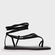 Sandália flat em couro, de salto rasteiro e bico quadrado. Possui uma tira sobre o hálux que se estende em formato de Y sobre o peito do pé, subindo até o tornozelo com fechamento por amarração.
