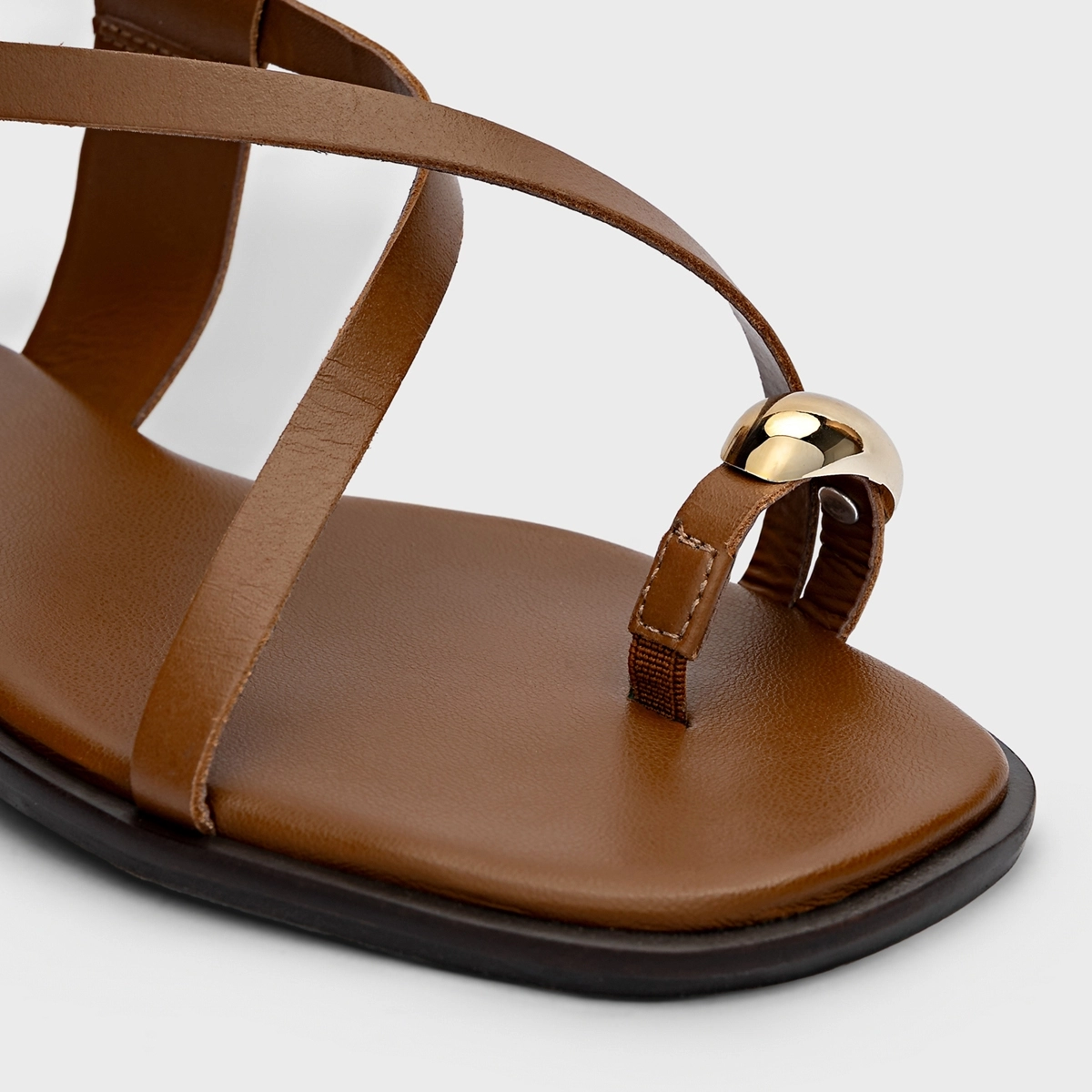 Sandália flat em couro de bico arredondado. Possui tiras delicadas que se cruzam no peito do pé e fechamento em fivela no tornozelo. Destaque para o detalhe em metal dourado sobre o dedo grande.