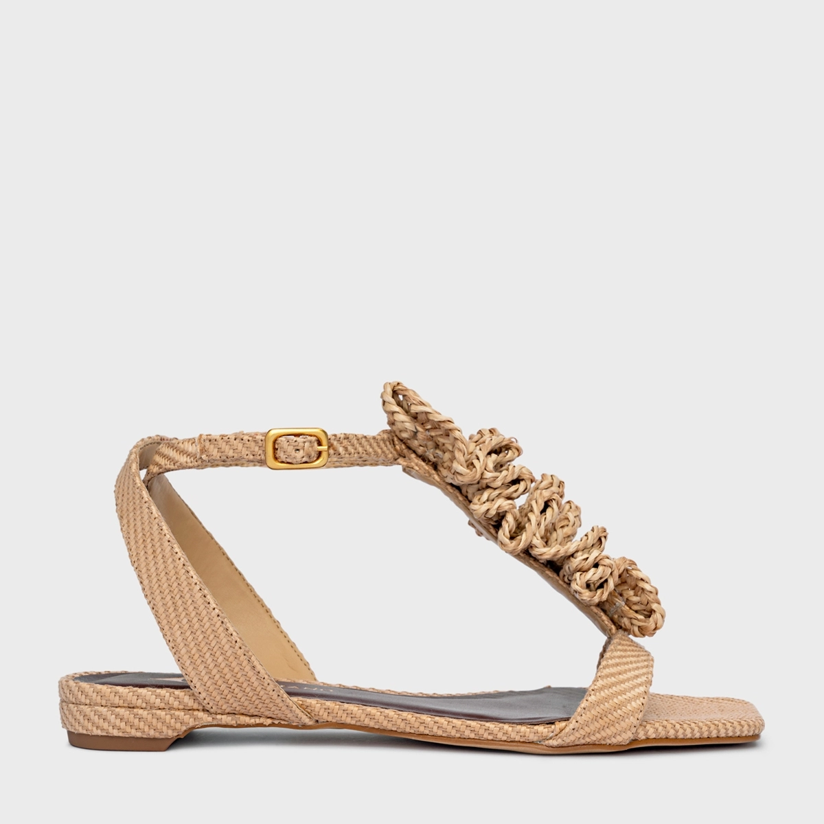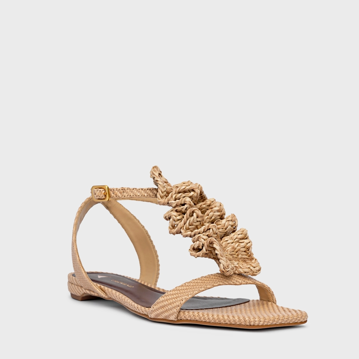 Sandália flat em tramado com bico quadrado. Possui tira larga sobre os dedos e aplicação de babados no peito do pé, que conferem textura e movimento ao modelo. Fechamento por fivela no tornozelo.