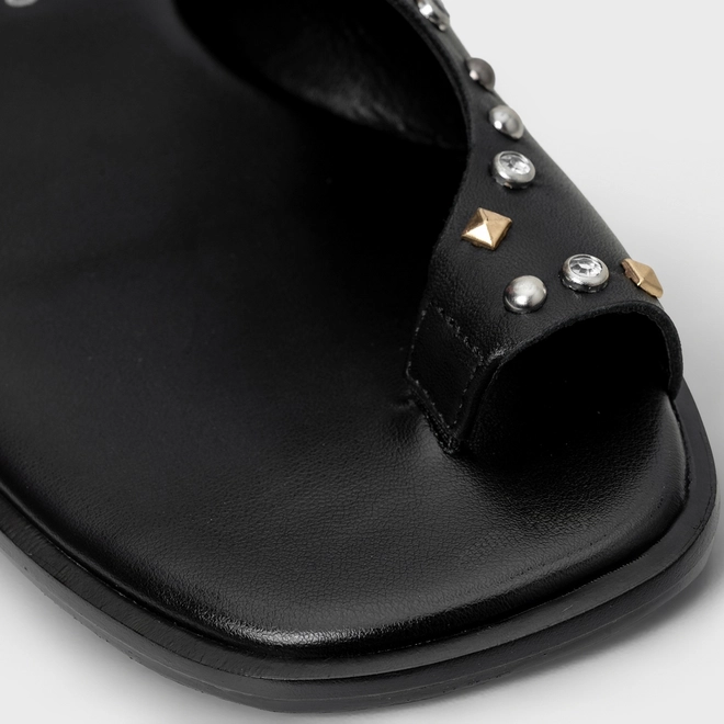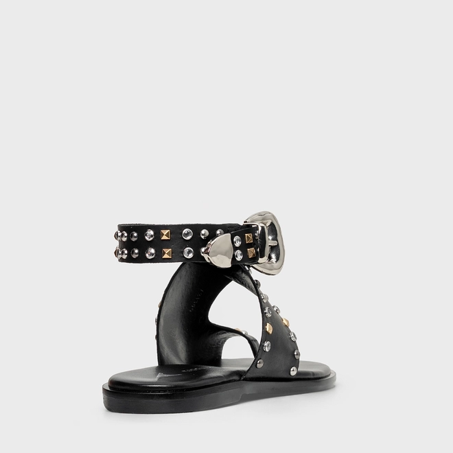 Sandália em couro com salto bloco baixo e bico arredondado. Conta com tira sobre o hálux que se estende cruzando o peito do pé, fechamento em fivela no tornozelo e aplicações de studs metálicos.
