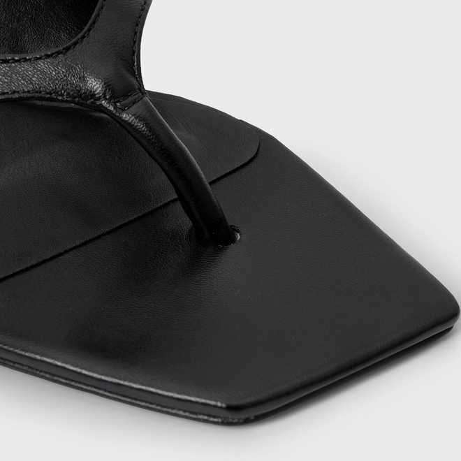 Sandália thong em couro com bico quadrado e salto bloco baixo. Modelo com tiras que separam os dedos e tira no tornozelo que efetua o seu fechamento.