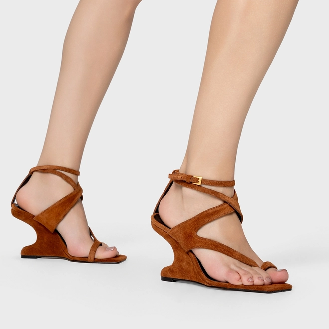 Sandália anabela em couro suede, com salto levemente recuado para dentro. Bico quadrado e tira fina entre os dedos, além de tiras que se cruzam e envolvem o peito do pé.