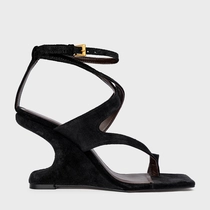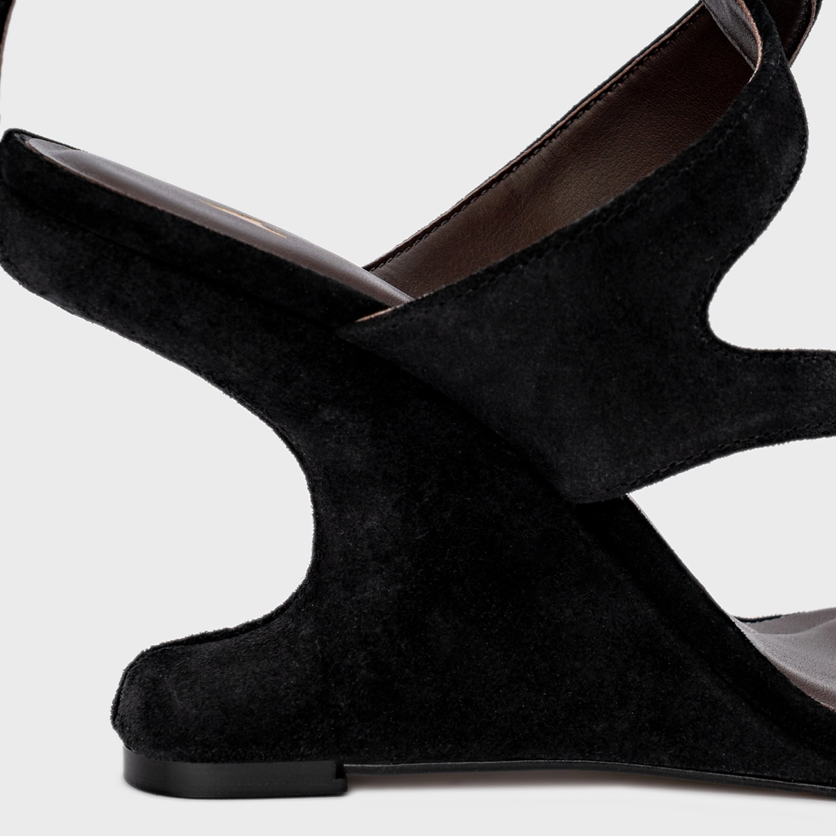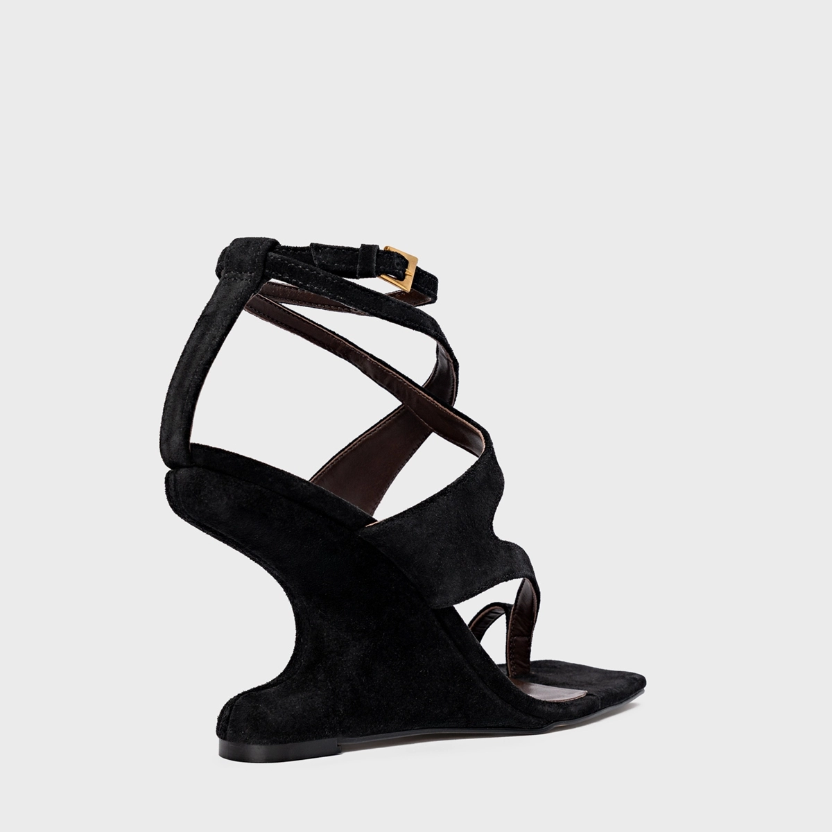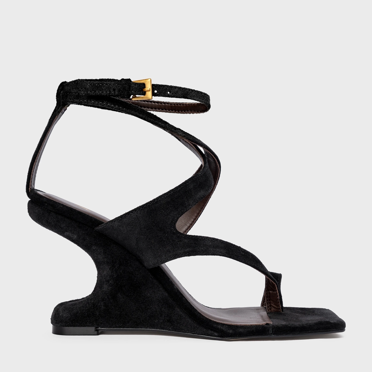 Sandália anabela em couro suede, com salto levemente recuado para dentro. Bico quadrado e tira fina entre os dedos, além de tiras que se cruzam e envolvem o peito do pé.