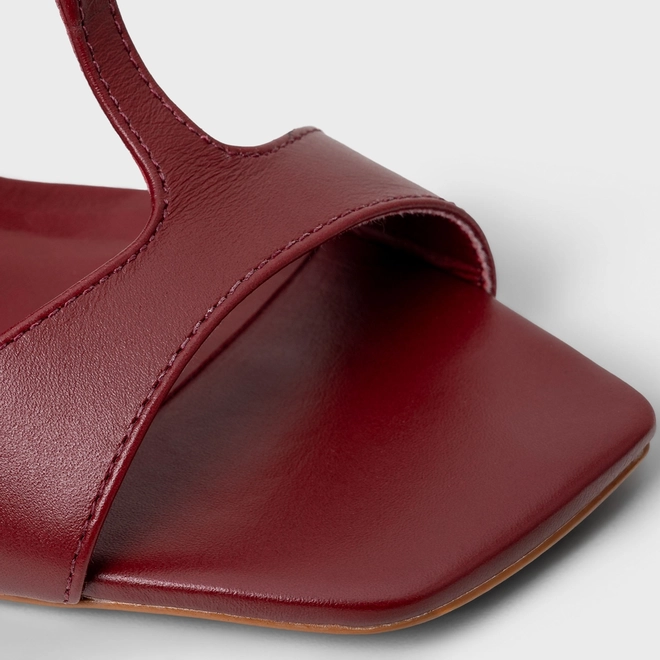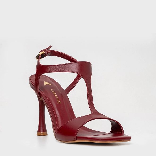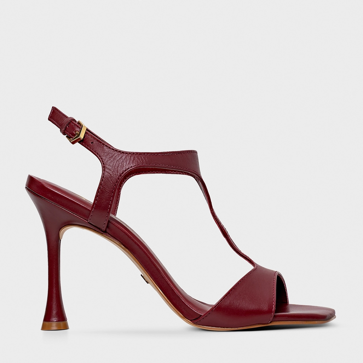 Sandália de couro com bico arredondado e salto alto estilo pino. Possui tira em formato de “T” no peito do pé, que envolve o tornozelo com fechamento por fivela ajustável.