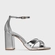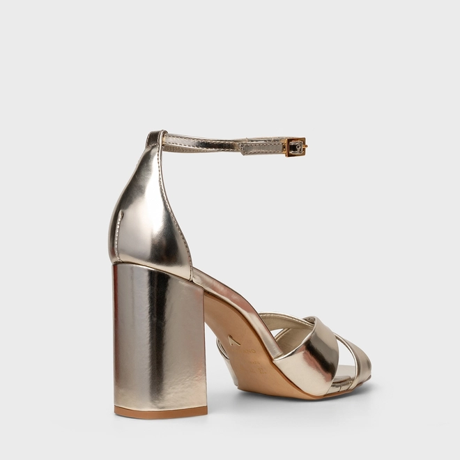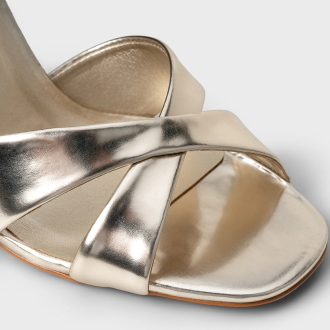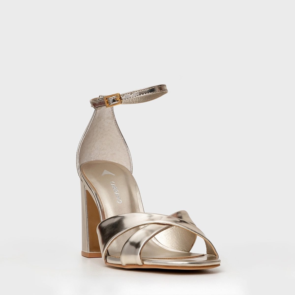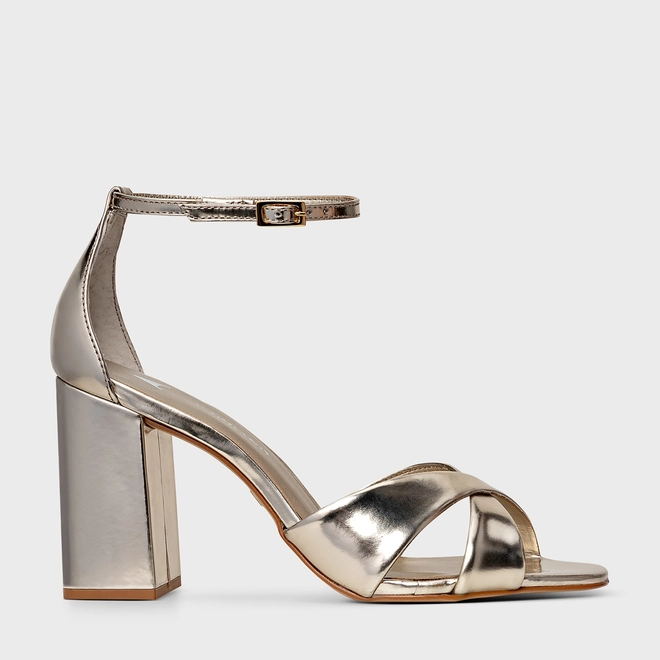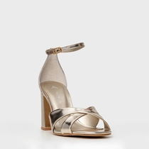 Sandália Glam Tiras Cruzadas Salto Bloco Couro Spechio Metalizado Champagne