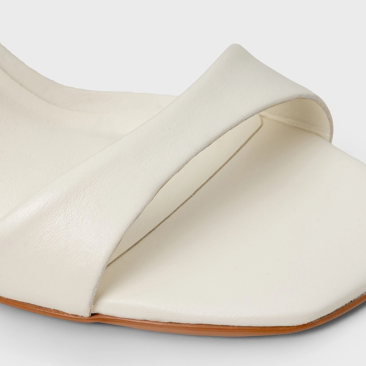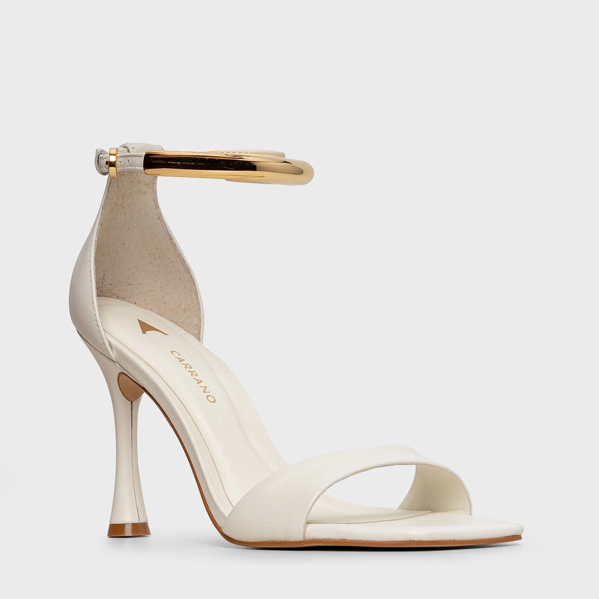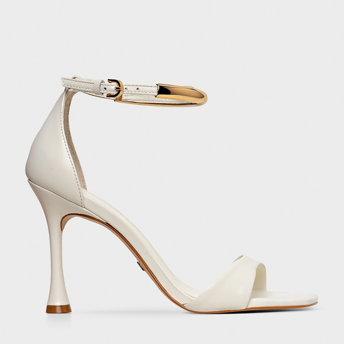 Sandália em couro com salto alto estilo pino e bico arredondado. Tira larga sobre o peito do pé e detalhe metálico dourado no tornozelo, em formato de bracelete com fechamento por fivela ajustável.