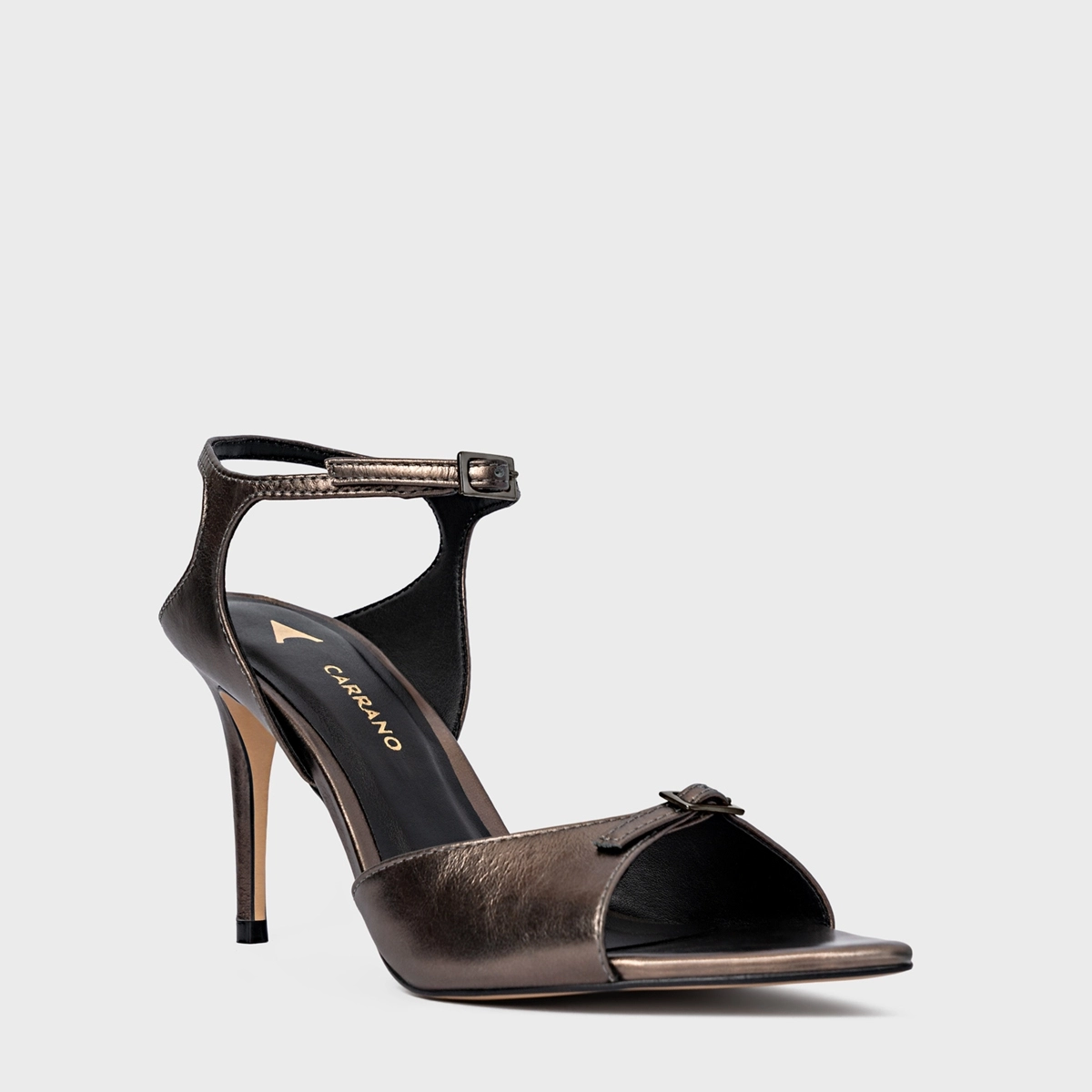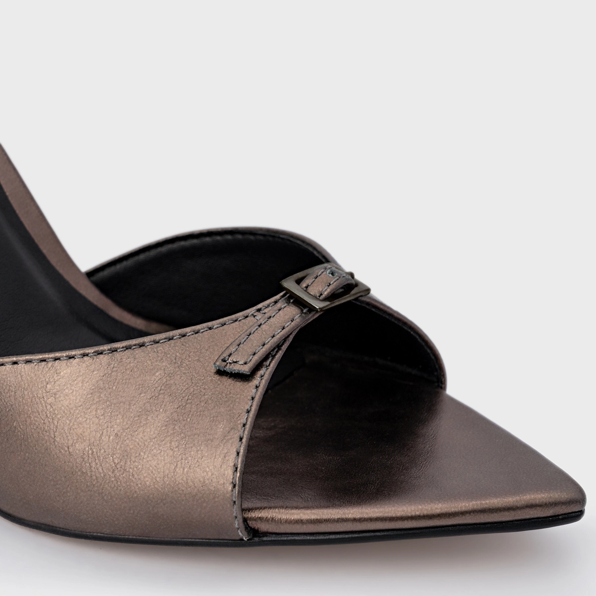 Sandália bico folha em couro metalizado. Possui salto fino, tira sob os dedos com detalhe de fivela decorativa e fechamento por fivela ajustável.