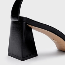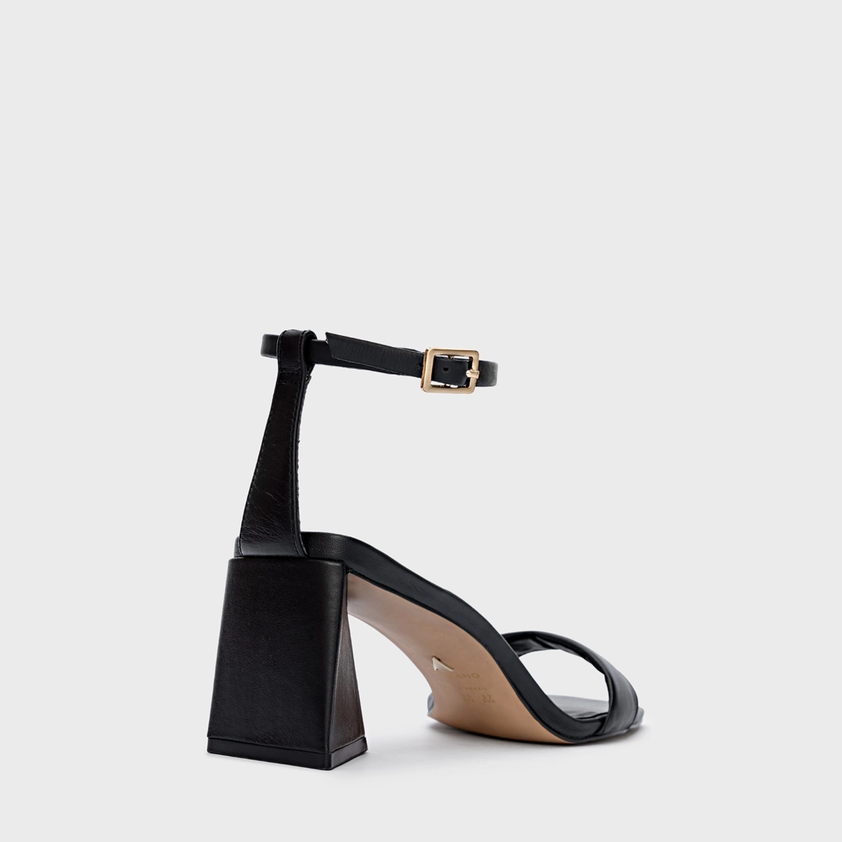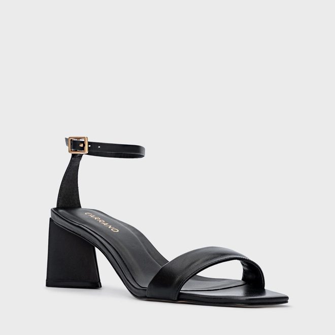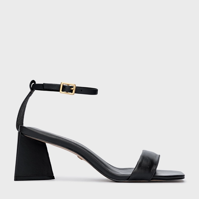 Sandália em couro com salto geométrico de tamanho médio e bico quadrado. Possui uma tira sobre os dedos e outra envolvendo o tornozelo onde tem seu fechamento por fivela.