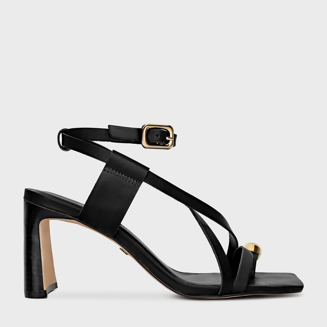 Sandália em couro de bico quadrado. O modelo traz tiras delicadas que envolvem o pé e fechamento em fivela no tornozelo, salto médio reto e detalhe de metal dourado sobre o dedo grande.