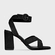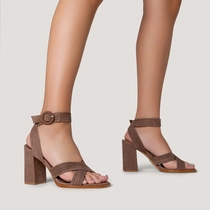 Sandália em couro nobuck com salto bloco alto e bico arredondado. Conta com tiras cruzadas sobre os dedos e outra no tornozelo com fechamento em fivela.