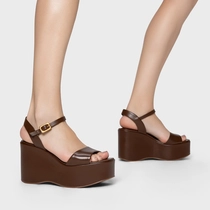Sandália maxi anabela em couro. Possui o bico arredondado, tira acima dos dedos e fechamento por fivela ajustável.