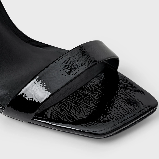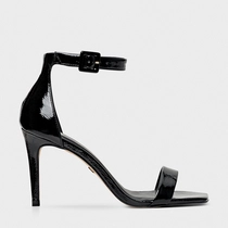 Sandália em couro verniz com salto fino alto e bico quadrado. Conta com tira sobre os dedos e outra no tornozelo com fechamento em fivela.