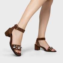 Sandália em couro suede, com salto bloco. Possui o bico arredondado, tira acima dos dedos com adornos decorativos e fechamento por fivela ajustável.