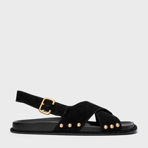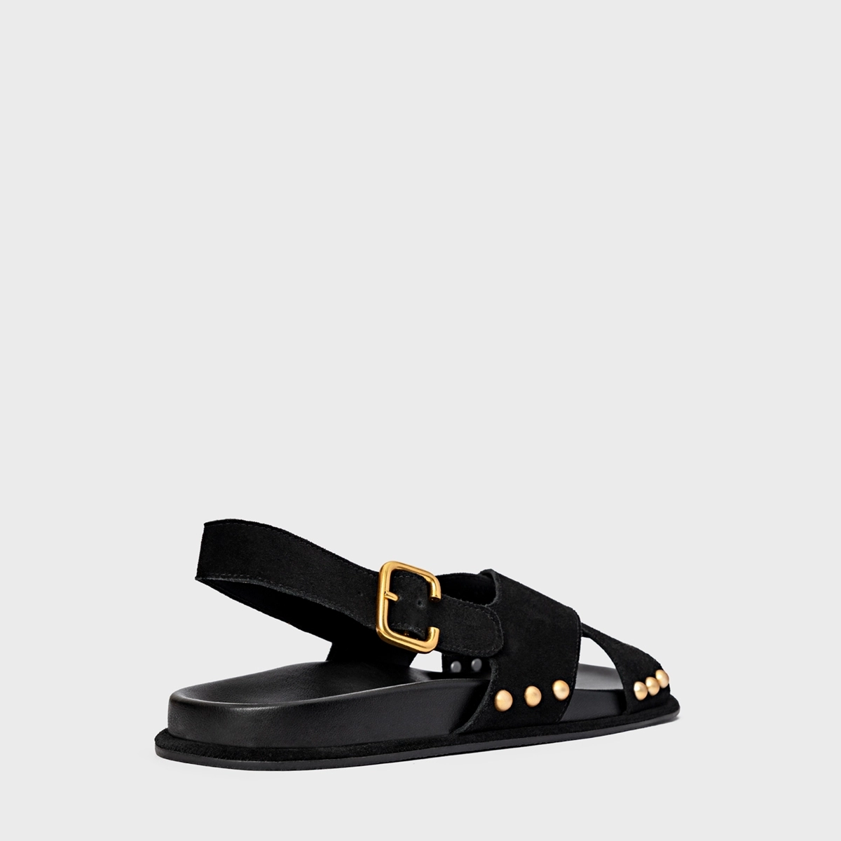 Sandália papete em couro suede. As tiras largas se cruzam dos dedos ao peito do pé, com tachas aplicadas na lateral e fechamento em fivela no calcanhar.