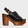 Sandália de couro com salto plataforma em madeira e bico arredondado. Conta com tira larga sobre o peito do pé, deixando os dedos e parte traseira à mostra, adornos laterais e fechamento em fivela.