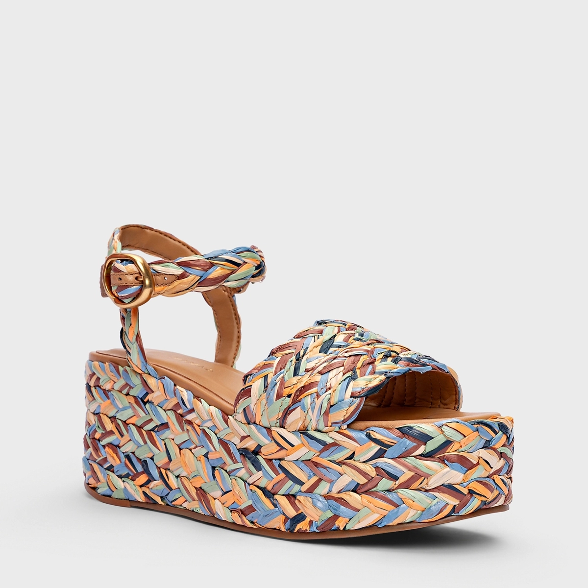 Sandália plataforma de salto estilo anabela em ráfia com bico arredondado. Conta com uma tira larga sobre os dedos e fechamento em fivela no tornozelo.