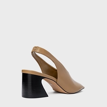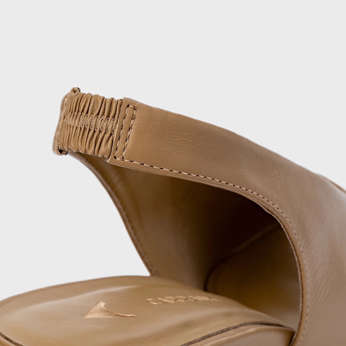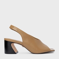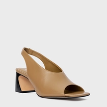 Sandália slingback em couro, com salto em formato geométrico. Possui decote arredondado e tira que efetua seu fechamento com elástico traseiro para facilitar o calce.