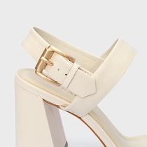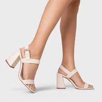 Sandália em couro, com salto de shape único. O modelo apresenta duas tiras uma sobre o peito do pé e outra sobre os dedos. Seu fechamento é feito por tira afivelada contornando o calcanhar.