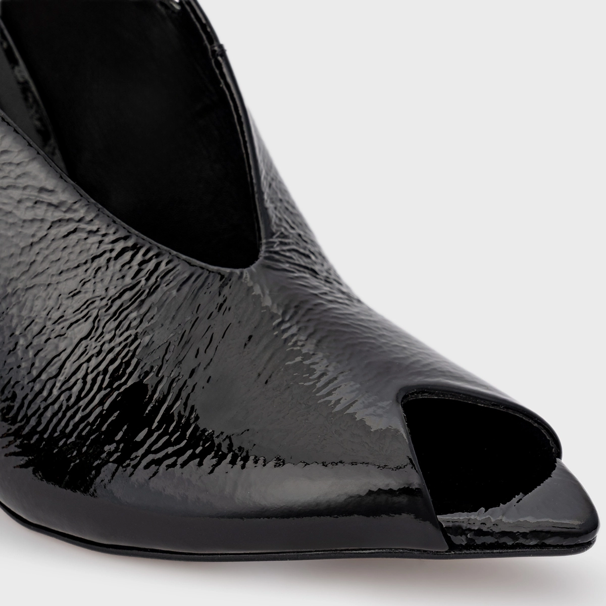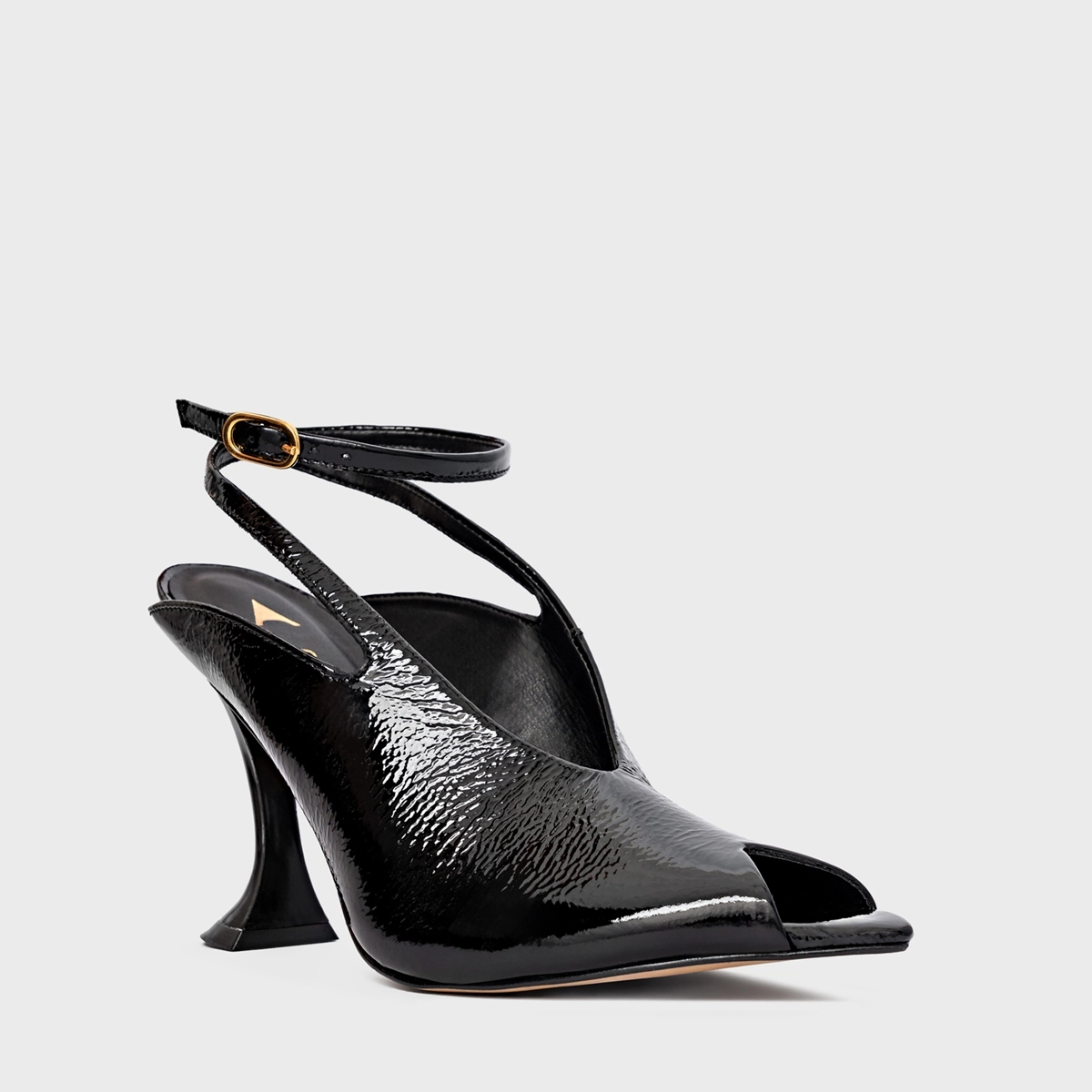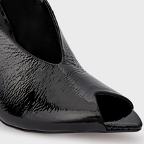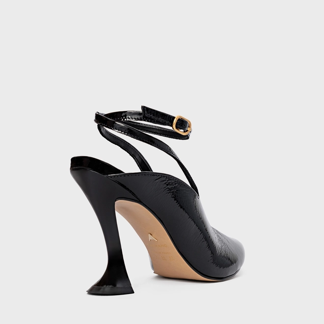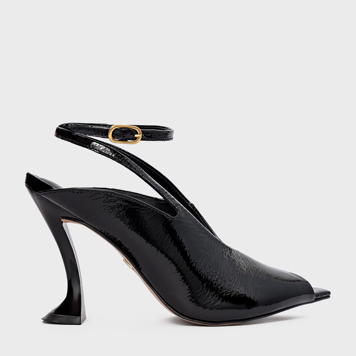 Sandália de bico fino, com recortes laterais no cabedal e nos dedos, além de tira fina no tornozelo com fechamento em fivela. O modelo conta com salto médio de formato curvo e acabamento interno.