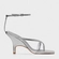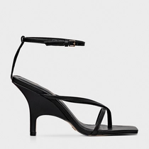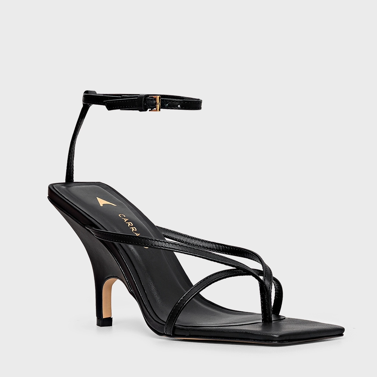 Sandália de couro com salto alto e bico quadrado. Modelo aberto, com tira sobre os dedos, tiras que separam os dedos e laterais que envolvem o pé e fechamento em fivela ajustável no tornozelo.