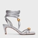 Sandália de couro com bico quadrado e salto fino médio. Possui tiras finas com amarração no tornozelo e esferas douradas aplicadas.
