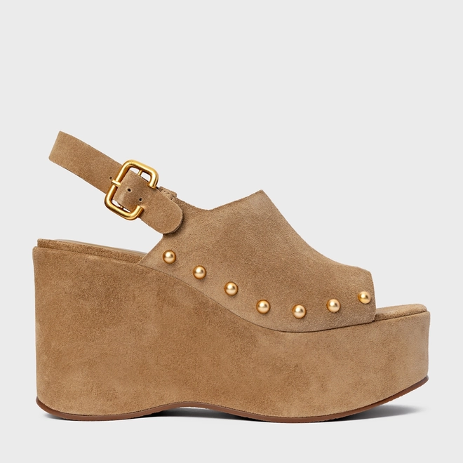 Sandália Statement Studs Maxi Anabela Couro Suede Bege Almond