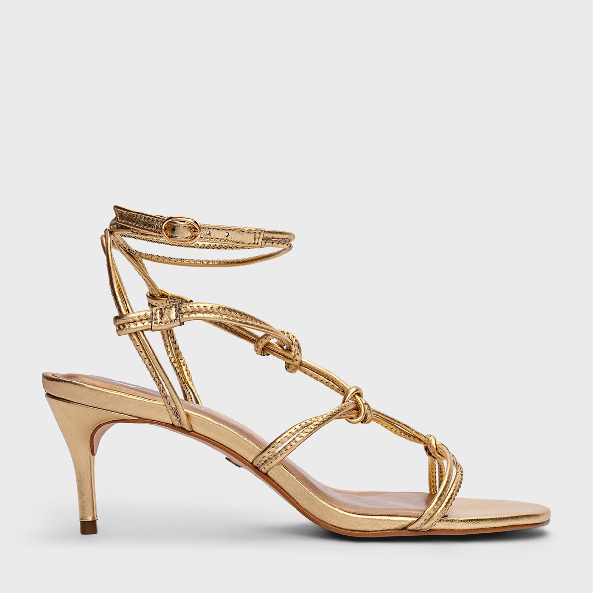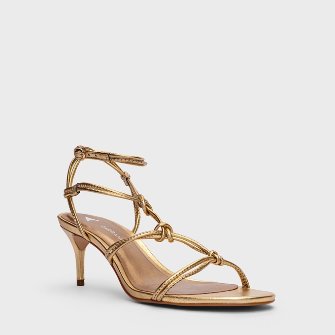 Por que apostar? Com brilho sofisticado e linhas delicadas, a sandália entrega leveza e elegância sem esforço. As tiras finas com nós desenham o pé com sutileza, enquanto o salto fino médio alonga a silhueta na medida certa, um modelo que transita de eventos a produções urbanas com naturalidade. Como usar? Combine com vestidos midi acetinados ou saias de alfaiataria para um look refinado. No dia a dia, funciona com calça reta e blazer minimalista. À noite, tente com peças em tecidos fluidos e acessórios discretos.