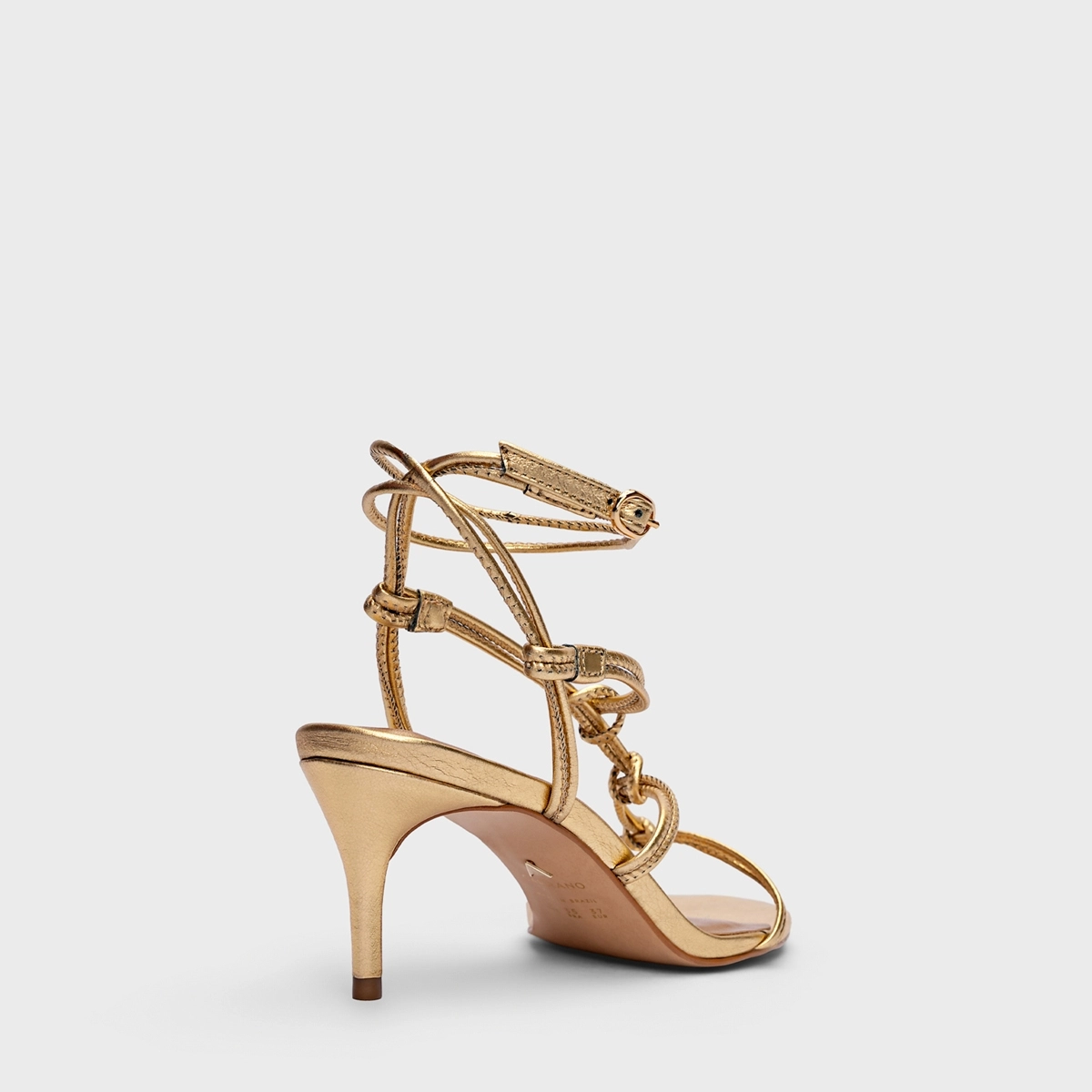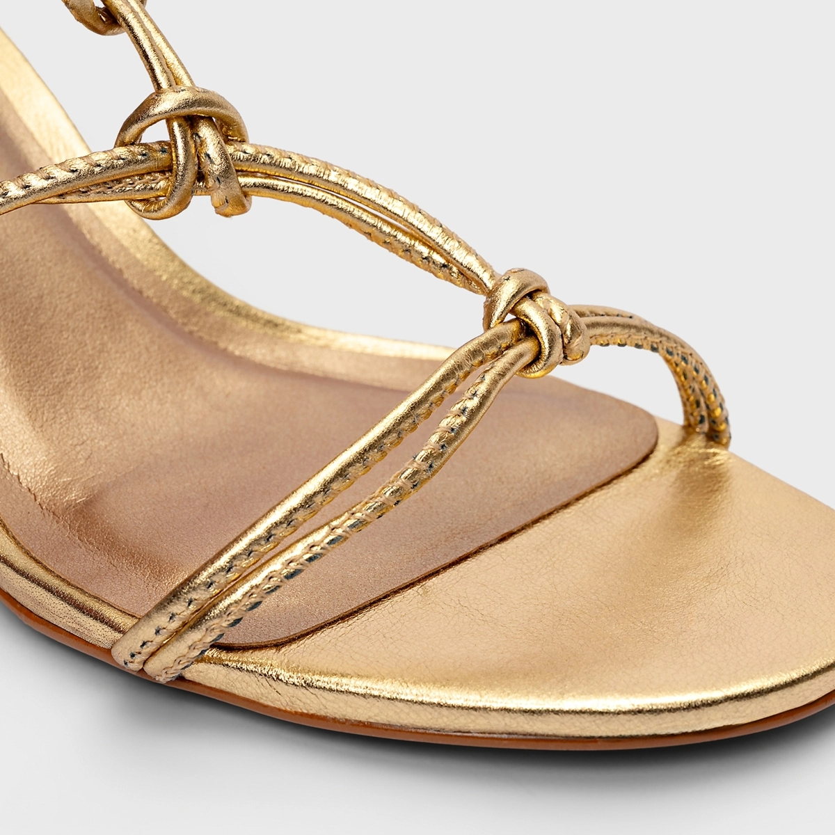 Sandália de couro, bico arredondado e salto fino médio. Conta com tiras finas e nós sobre os dedos e envolvem o pé até o tornozelo que possui fechamento por fivela.