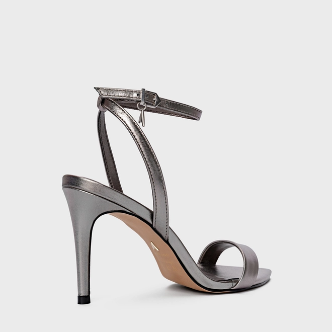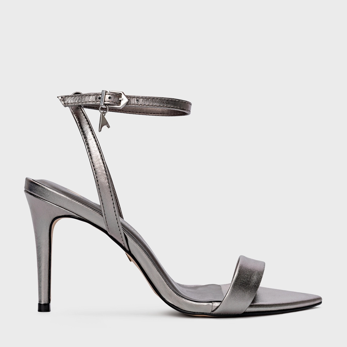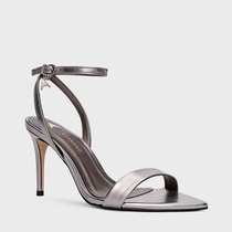 Sandália em couro com salto fino alto e bico folha. Conta com tira sobre os dedos e outra no tornozelo com fechamento em fivela.