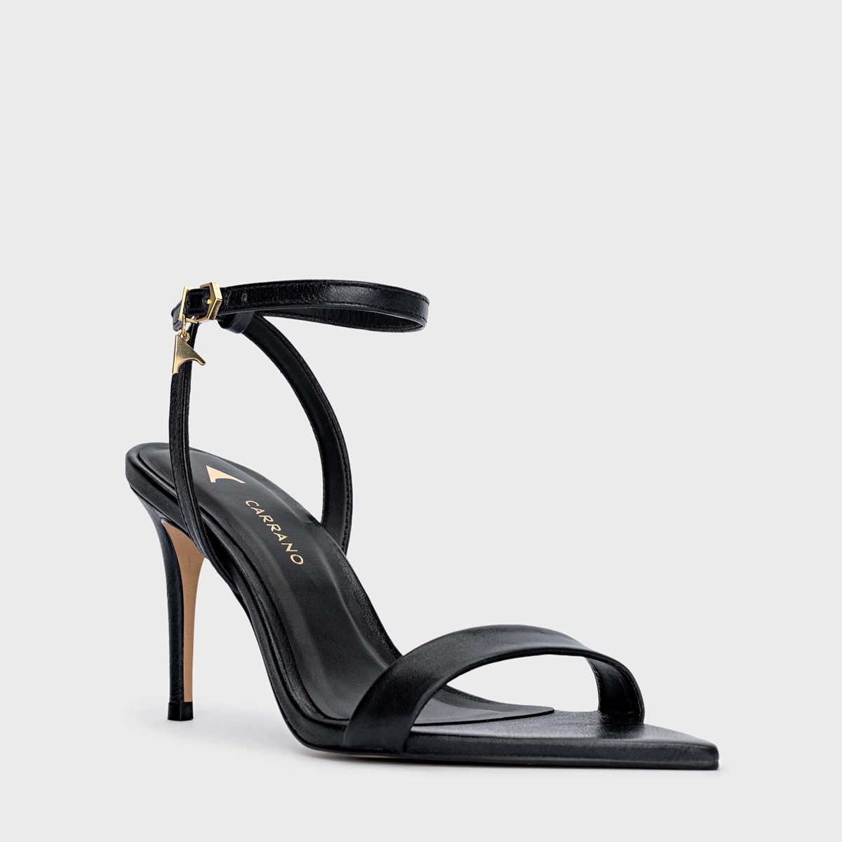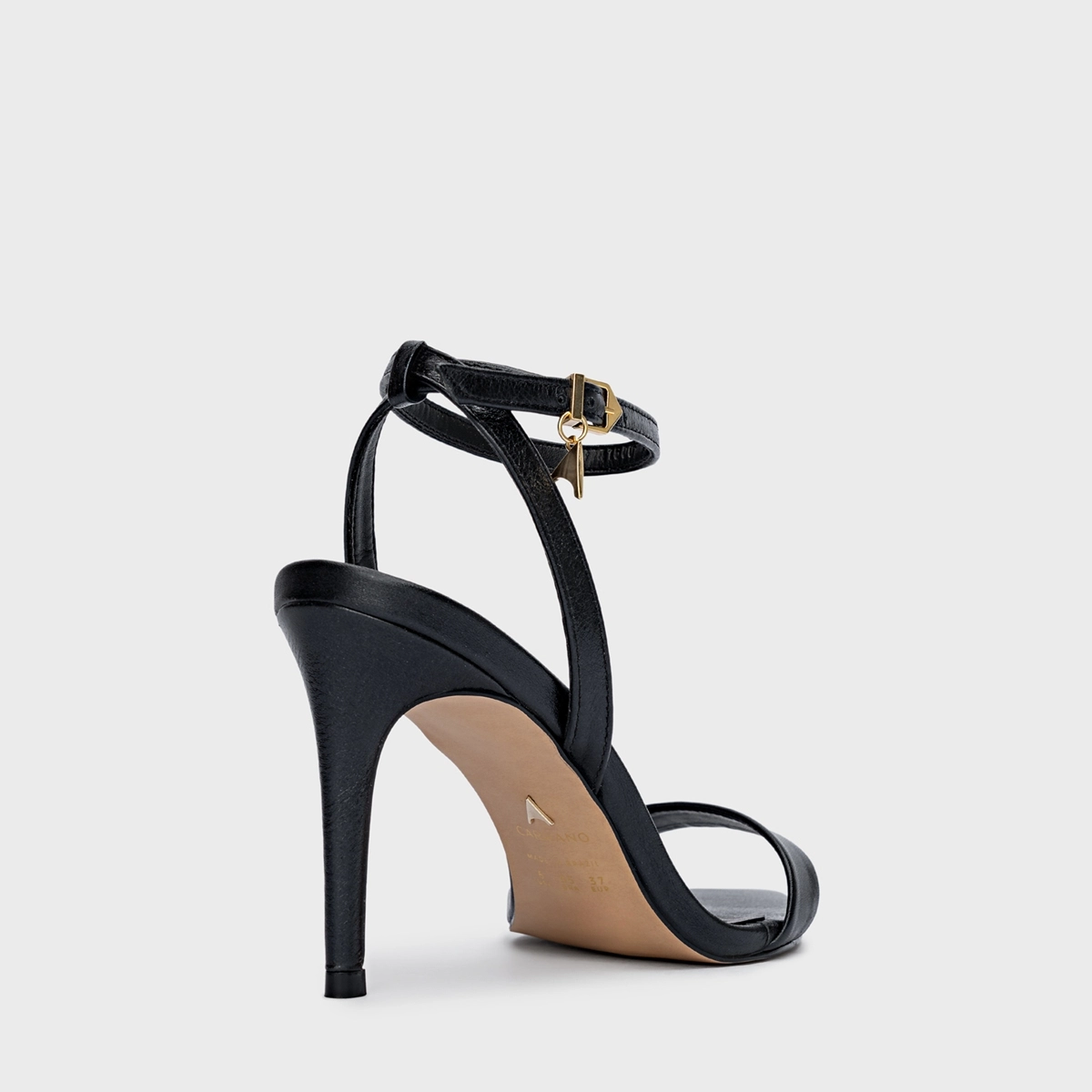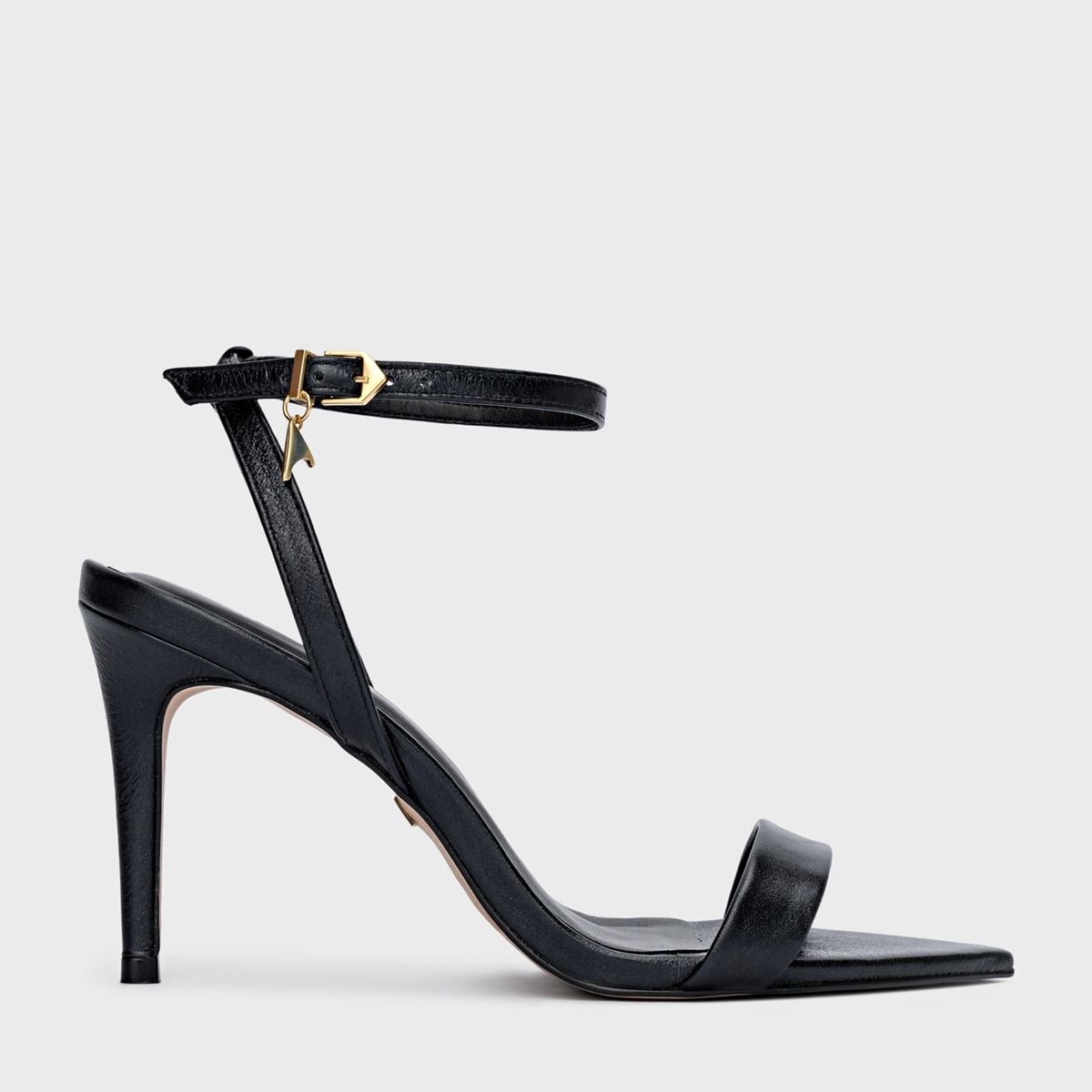 Sandália em couro com salto fino alto e bico folha. Conta com tira sobre os dedos e outra no tornozelo com fechamento em fivela.