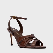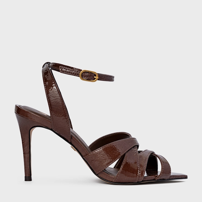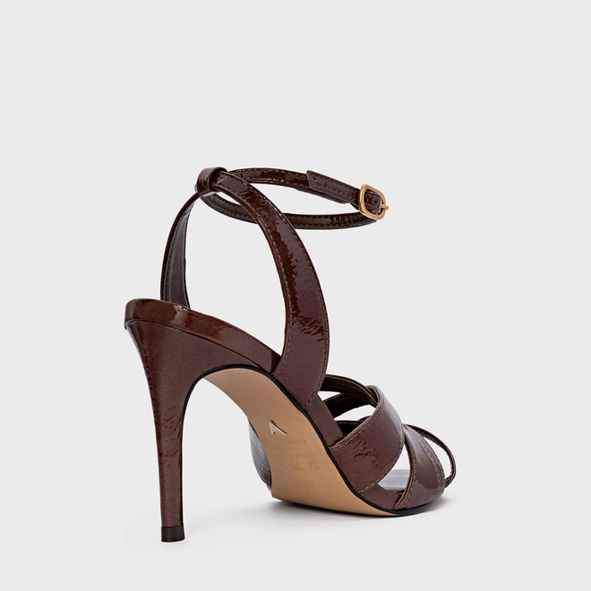 Sandália Tiras Cruzadas Salto Fino Couro Verniz Marrom Brownie