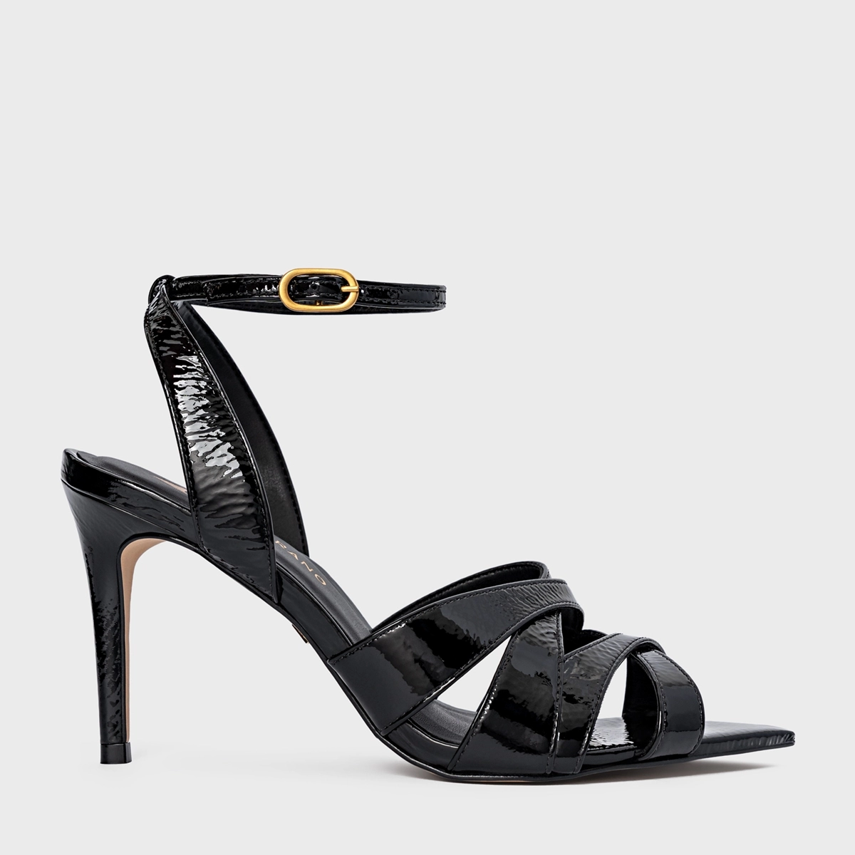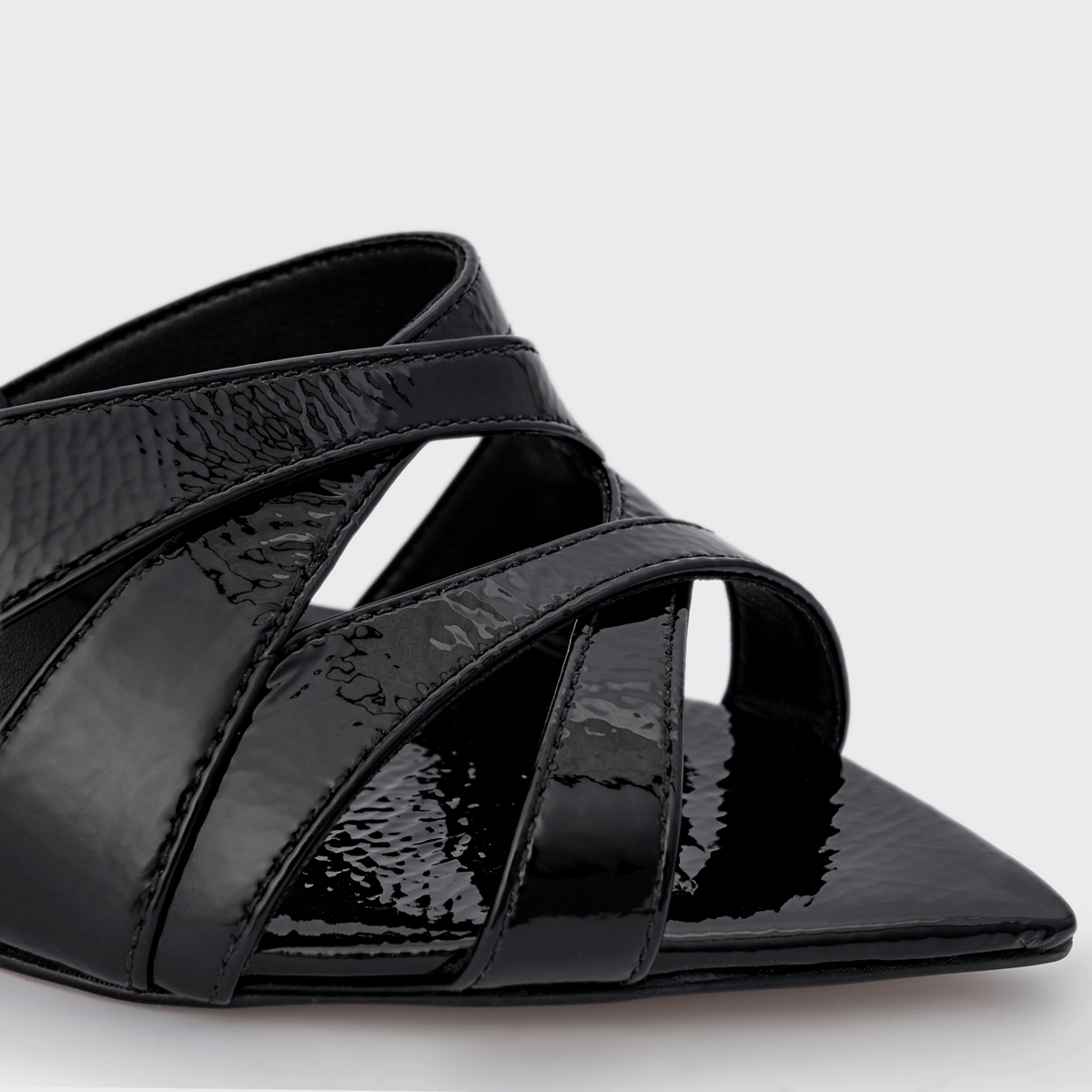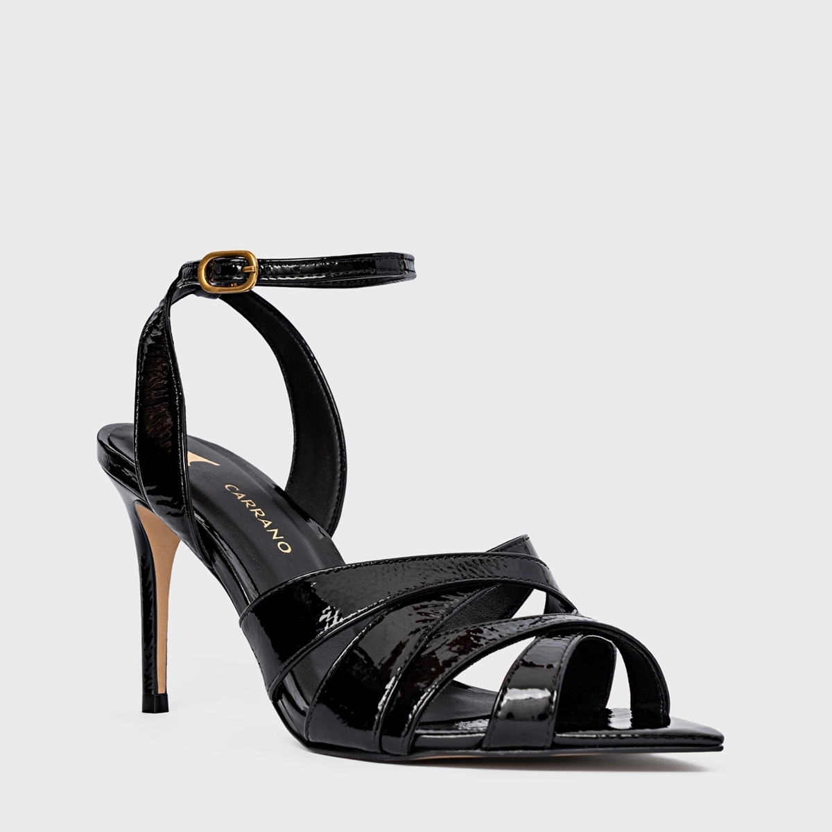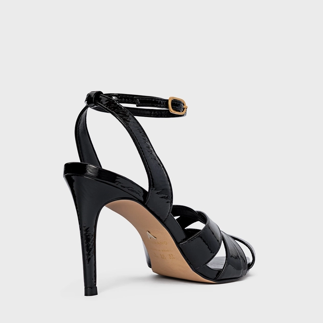 Sandália Tiras Cruzadas Salto Fino Couro Verniz Preto