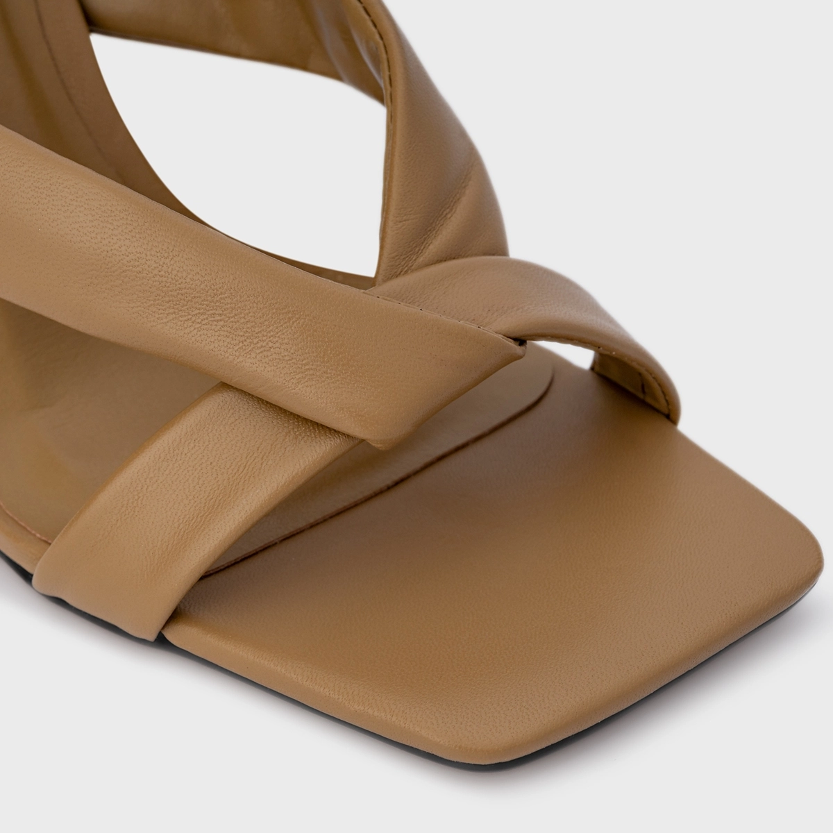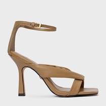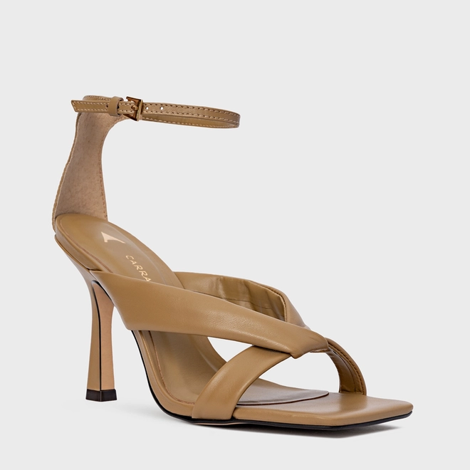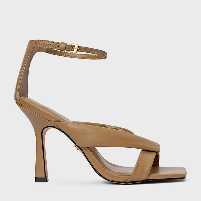 Sandália Tiras Puffy Salto Fino Couro Bege Almond