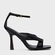 Sandália em couro, com salto fino e bico quadrado. Possui tiras acolchoadas que cruzam o cabedal e tira no tornozelo com fechamento por fivela ajustável.