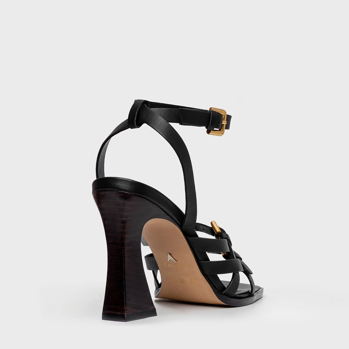 Sandália Tiras Salto Bloco Wave Couro Preto