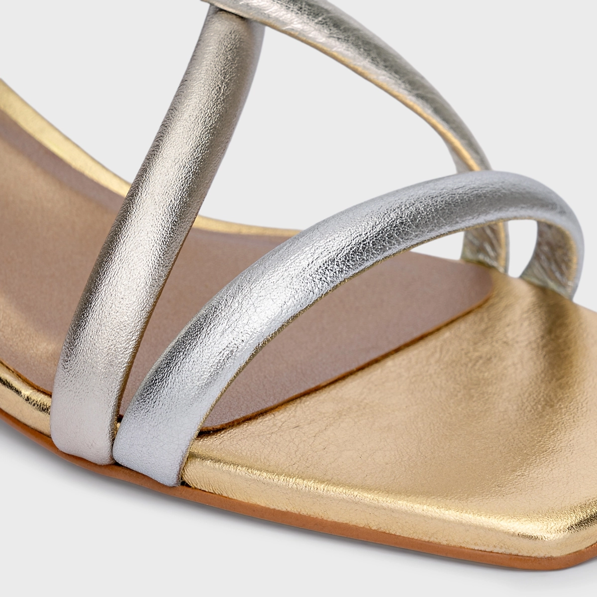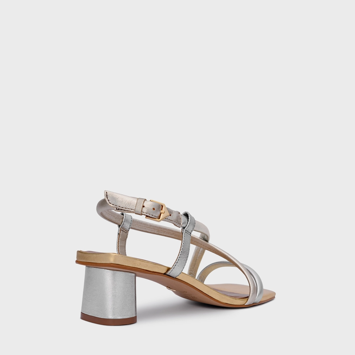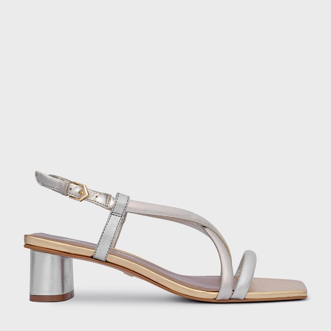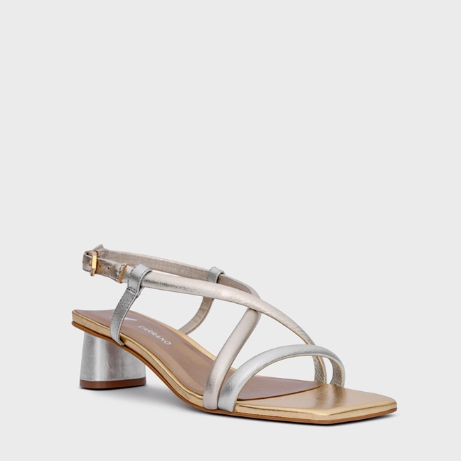 Sandália Tiras Salto Oval Médio Couro Metalizado Mix