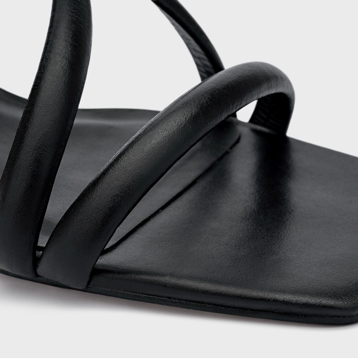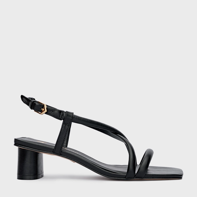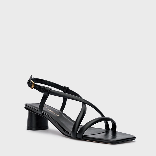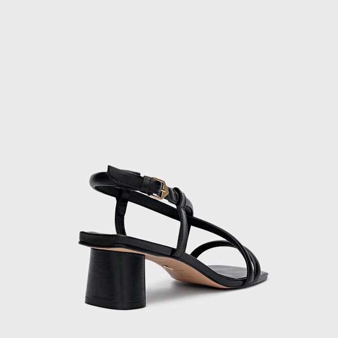 Sandália de couro com bico quadrado e salto oval médio. Possui tiras finas cruzadas sobre o peito do pé e fechamento lateral por fivela.