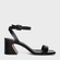 Sandália em couro com salto médio em formato geométrico, possui duas tiras, uma no peito do pé e outra nos dedos. Conta com um bico quadrado e fechamento em fivela ajustável.