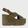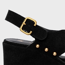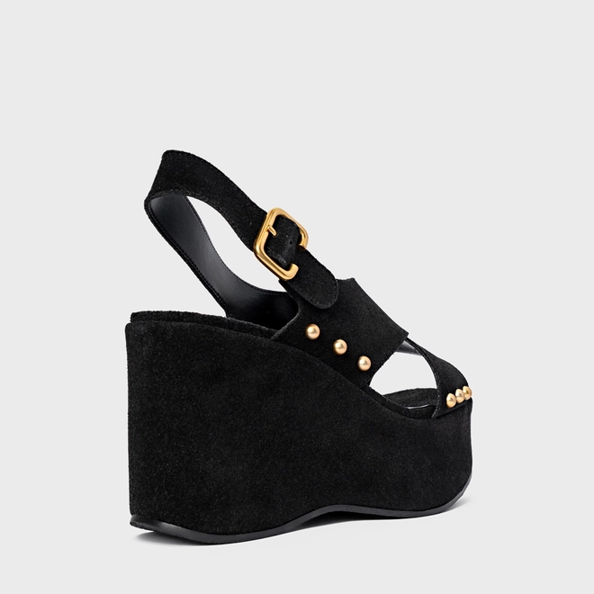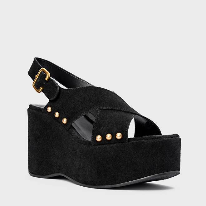 Sandália plataforma em couro suede. As tiras largas se cruzam dos dedos ao peito do pé, com tachas aplicadas na lateral e fechamento em fivela no calcanhar.